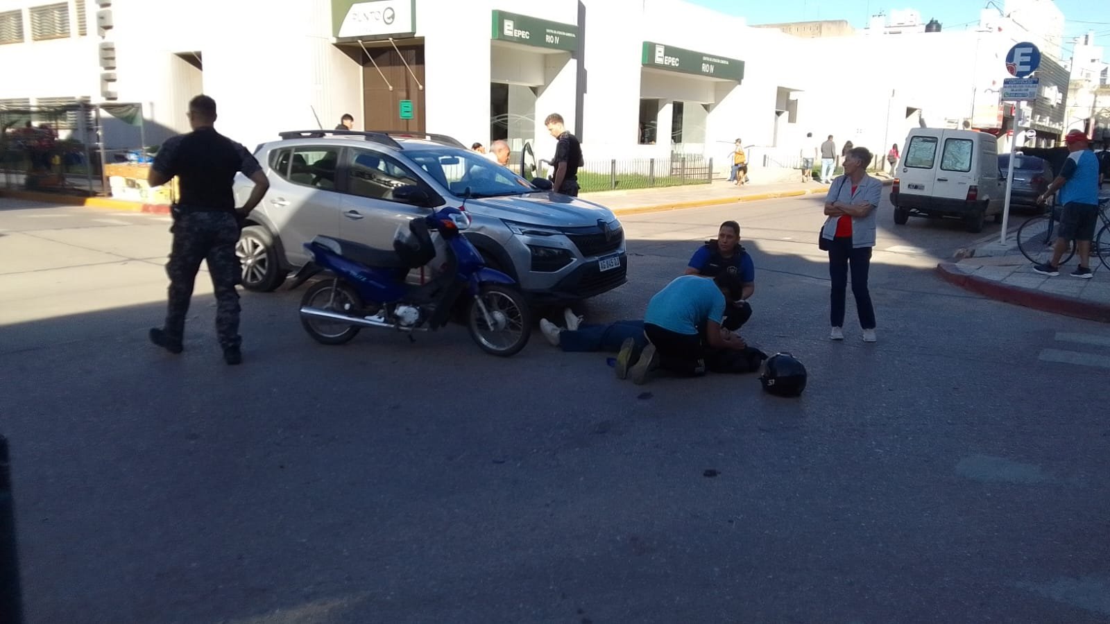 El siniestro ocurrió en la esquina de Hipólito Yrigoyen y Vélez Sarsfield entre un Renault Sandero y una moto 110 en la que viajaban dos personas.